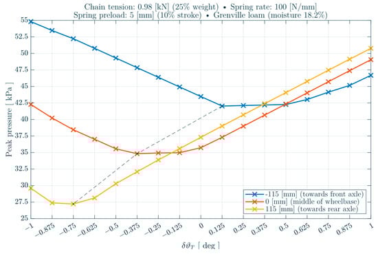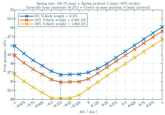 The vehicle wheelbase is 768 mm. The distance separating the frame center of mass from the middle of the wheelbase for the blue and yellow curves is set as equal to 15% of the wheelbase. First, a substantial increase in the minimum peak pressure is observed when passing from the yellow to the blue curve (from about 27 kPa to 43 kPa); this is easily explained by the increased fraction of the vehicle weight supported by the front wheel/track reconfigurable axle. For the same reason, as the center moves towards the front axle, the control target deviation necessary to achieve the minimum peak pressure increases: equal to −0.75° for the yellow curve, −0.375° for the orange curve, and 0.125° for the blue curve.