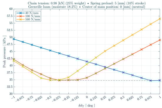Equation (52) shows that if a certain force is to be developed on a given terrain, the softer the spring (the lower ks), the further the control system has to push the idler to achieve a minimum peak pressure (the higher the δϑT). An comparable result is obtained by varying the preload of the spring, as shown in Figure 24.