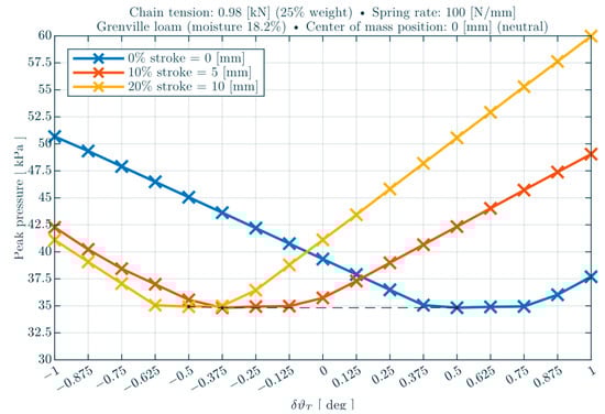 Such effect is important because it is reasonable to expect that the distribution of mass on the vehicle (specifically the payload) will likely change during normal operation. The control target deviation (δϑT) is given for the x axis and varies from −1° to 1°, whereas for the y axis, it is the peak of the pressure distribution between track and ground. Three curves are shown: