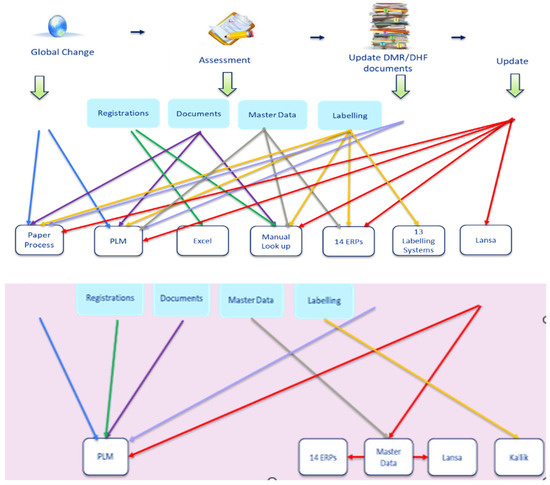 In addition to the above challenges, Company X has many disparate processes to manage product master data and document changes across the organisation. These result in very complicated workflows that can be challenging to manage and control, resulting in manual processes with many resources required to maintain them. Value Steam Mapping was utilised to map the current process and identify all non-value add (NVA) wastes [50]. Figure 3 demonstrate schematics based on the high-level VSMs before and after implementation of the Industry 4.0 project (Note: a schematic has been included rather than the original VSMs for legibility purposes). The new system creates pull and flow, adds value and can aid continuous improvement. The new system is more “Lean” and has a less complicated process resulting in reduced overprocessing and more streamlined processes for change management and master data maintenance.