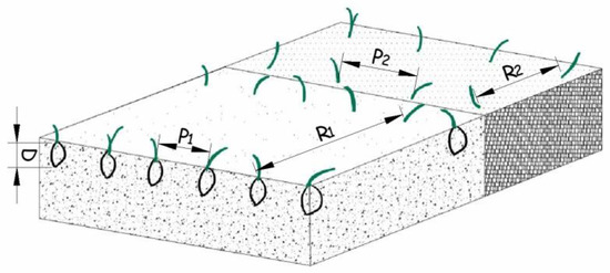 The selected hybrid garlic from Lai’an, Anhui Province [18] was sown in a finely ground, flat, and without residual tillage stubble, at a depth D of 30~40 mm, and the garlic seeds required for sowing were mainly done by manual splitting. There are two planting patterns for Lai’an hybrid garlic. The first is planted with row spacing R1 of 270~330 mm and plant spacing P1 of 65~70 mm. The second is planted with row spacing R2 of 170 mm and plant spacing P2 of 100 mm, and the density of both patterns is 30,000 plants/mu to 35,000 plants/mu, with a fertility period of about 240 days. Planting needs to ensure that single seeds are sown, as shown in Figure 1.