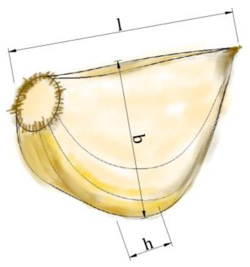 The seeds need to be separated from the seed rower as a single grain during sowing, and their morphological dimensions determine the size of the seed extraction structure of the seed rower, which in turn determines the size of the rower as a whole, so the morphological dimensions of the garlic seeds should be measured before the design study of the air suction garlic seed metering device, which can also effectively improve the accuracy and efficiency of the seed metering device [19]. One hundred randomly selected garlic seeds of good quality were used for three axial dimensions measurements, as shown in Figure 2.