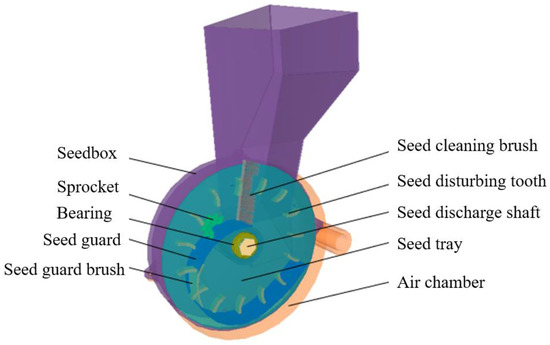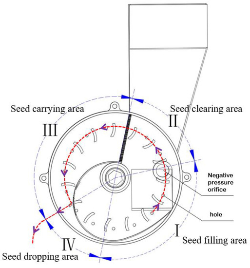 The disturbance air-suction garlic seed metering device [20] designed in this paper mainly consists of a seedbox, an air chamber, and a seed tray, as shown in Figure 4. The seed box and the seed tray have a seed-discharge shaft mounted in the center of the seed box and the seed tray via a bearing. The seed box is equipped with a seed guard, a seed guard brush and a seed-cleaning brush inside, and a negative pressure tube outside the air chamber. The surface of the seed tray has a circumferential distribution of holes and seed-disturbing teeth. During operation, the holes and teeth pass through the seed-filling area, seed-cleaning area, seed-carrying area, and seed-feeding area, as shown in Figure 5. The negative pressure pipe is connected to the negative pressure fan during operation and provides a continuous stable airflow. As the seed-discharge shaft rotates, the seed tray and the seed-disturbing teeth on it also rotate. The garlic seeds piled up in the seed-filling area are bothered by the disturbing teeth. During the movement, the garlic seeds are adsorbed by the negative pressure through the hole, and then the teeth carry the adsorbed garlic seeds into the seed-cleaning area. Some of the extra garlic seeds taken in the cleaning area were returned to the garlic seed population by gravity, and others were brushed off by the cleaning brush and returned to the population, leaving only one garlic seed in the seed-carrying area. Garlic seeds entering the seed-carrying area are still adsorbed on the type pore by negative pressure. When the garlic seeds move to the seed-dropping area, the negative pressure disappears, and the garlic seeds are discharged out of the hole under the action of gravity to complete the seeding work.