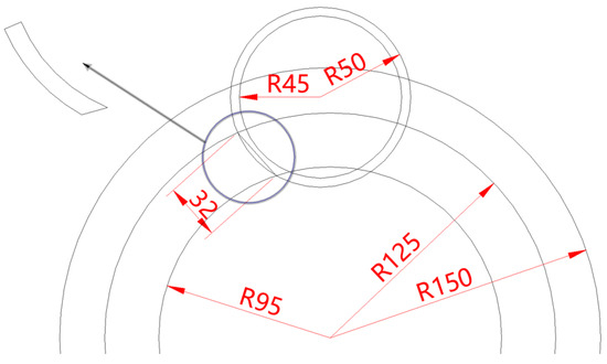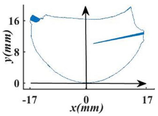 According to the average length of the garlic seeds and the equation of the contour of the back arch of the garlic seeds, the length of the seed-disturbing tooth is slightly larger than the average length of the garlic seeds. In this paper, the length of the disturbing tooth is 32 mm, so the arc of the tooth profile can be taken as a parabola in the range of (−16 mm, 16 mm), and the thickness of the tooth is taken as 5 mm. Following this, the left and right sides of the seed-disturbing tooth can be taken as arcs with radii of 45 mm and 50 mm, and the above and below contours consist of arcs with radii of 95 mm and 125 mm from the center of the seed tray. The four arcs form the outline of the disturbing tooth and are plotted as shown in Figure 10.