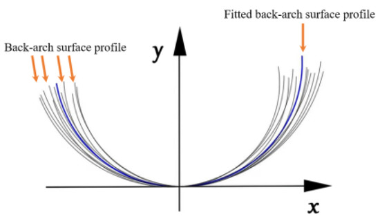 According to the garlic species back-arch surface profile, a blue parabola is fitted as shown in Figure 8, the vertex of the parabola passes through the origin, another point on the parabola is randomly selected, and a quadratic polynomial is used to obtain the equation of the blue parabola as