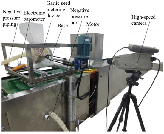 The above-measured garlic seeds were used as test materials. The air suction garlic seed metering device was installed on a JPS-12 seed disperser test stand (produced by China Harbin Bona Technology Co., Ltd., Harbin, China, with a seedbed belt speed of 1.5~12 km/h and seed dispersal shaft speed of 10~150 rpm), and other equipment required for the test were an electronic barometer (measuring range ±35 kPa, accuracy ±0.3% FSO) and an i-speed3 high-speed camera (produced by Japan Olympus company production, using cmos 1280 × 1024 sensor, speed up to 2000 frames/second full resolution recording), etc., the test equipment and installation location as shown in Figure 14.