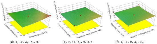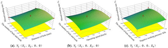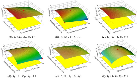 In the pass rate regression equation, the regression terms with highly significant effects (p < 0.01) are , , , , , and , and the effects of the remaining terms are insignificant. The degree of influence of the four factors on the pass rate, in descending order, is the number of tooth and hole combinations, hole diameter, negative working pressure, and operating speed. In the regression equation of the sowing rate, the regression terms with highly significant (p < 0.01) effects are , , , , and the regression terms with significant (0.01 < p < 0.05) effects are , , and the rest of the terms are insignificant, and the effects of the four factors on the sowing rate are, in descending order, the number of tooth and hole combinations, hole diameter, negative working pressure, and operating speed.