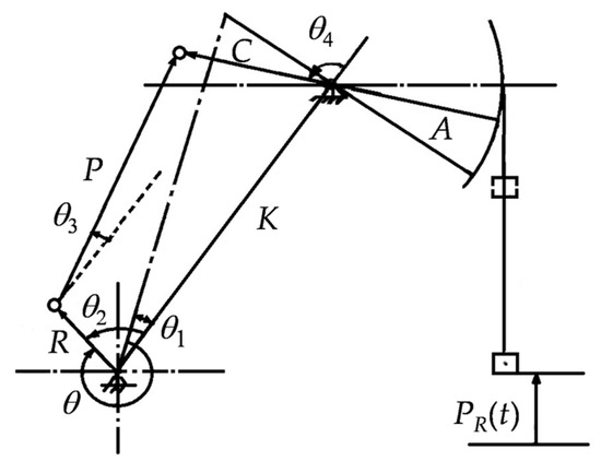 The geometric diagram of the four-bar linkage in a beam pumping unit is shown in Figure 1, where R is the radius of the crank, P is the length of the pitman, C is the length of the rear arm of walking beam, A is the length of the forearm of walking beam, and K is the length of the fixed bar.