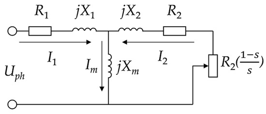 As is shown in Figure 2 [40,41], most of the equivalent circuit of a motor is T-circuit. When the values of the circuit parameters R1, R2, X1, X2, and Xm, are given, the motor torque and the input power can be calculated as follows without consideration of the mechanical loss: