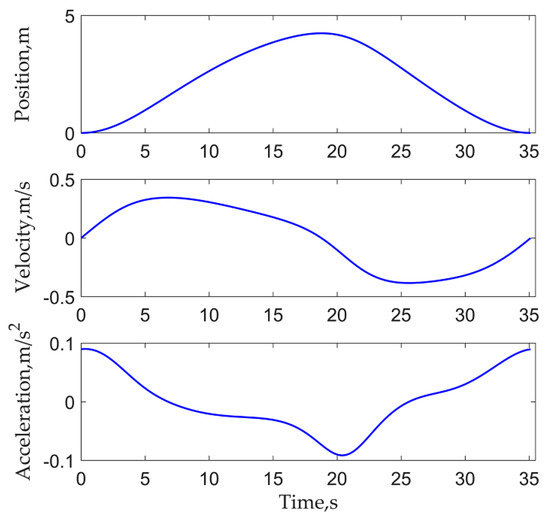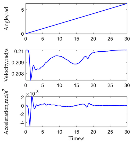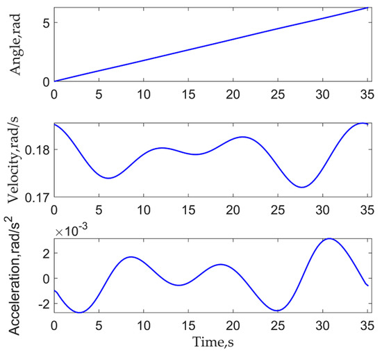 The motor is Y250M-12 with nameplates parameters PH = 22 kW, nH = 485 rpm, λk = 2.0, ηH = 93.0%. Since iMB is 0.037, the crank velocity can be calculated according to Equations (28) and (33) with the above nameplate parameters. Figure 12 shows the crank angle and acceleration can be obtained by integrating and differentiating the crank velocity.