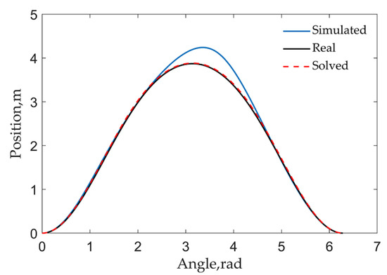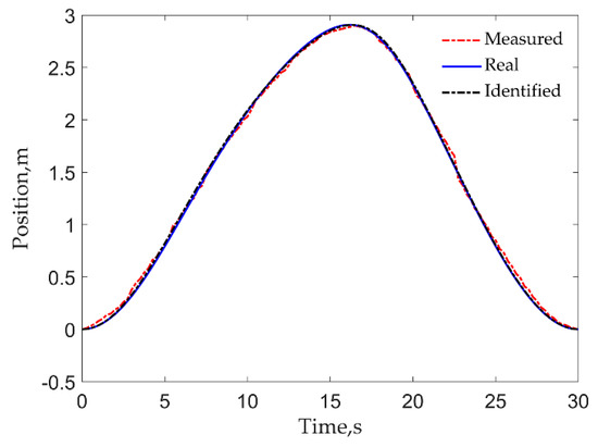 To illustrate the effect of the identified results on the polished rod position, Figure 13 shows the measured, real, and identified polished rod positions, in which the real polished rod position is calculated according to the real size values while the identified one is calculated according to the identified size values. As is illustrated in Figure 13, the identified polished rod position is consistent with the real one while the measured polished rod position is different from the real one, which indicates that the algorithm converges to the real polished rod position rather than the measured one.