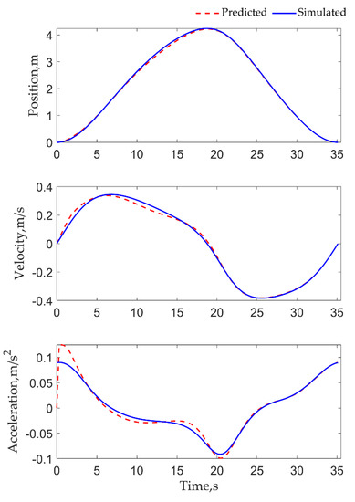 According to the differences between the measured and the approximated data shown in Figure 11, the noise covariances of the polished rod position, velocity, and acceleration can be obtained with the var function of MATLAB, that is, Rp is 0.0003, Rv is 0.0022 and Ra is 0.0233.