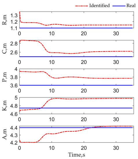 To better show the advantages of the proposed algorithm, a comparison with several current identification methods is performed. The identification method is RLS method [49], EKF [50], UKF [32,51], and RGD method [52], respectively. The needed data are for Section 4.4 and the measured covariance is Rv. In the method of RLS, EKF, and RGD, the Jacobian matrix is obtained through the complex step differentiation [53]. In RGD method, the information vector is derived from the Jacobian matrix and . In the method of UKF, .