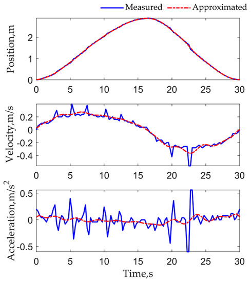 The measured field data are the series data of the polished rod position and motor in-put power in an oil well of Shengli Oilfield of PetroChina. The type of the beam pumping unit is CYJY10-3-53HB with the pumping speed of 2 times/min. The length N of the series is 121. The measured field data are presented in Figure 10. The velocity and acceleration obtained by differentiating the polished rod position are shown in Figure 11. As can be seen from Figure 11, the noises in the velocity and acceleration are loud. For direct illustration of the measurement noise, the polished rod position can be approximated by the truncated Fourier series [48] when the number of Fourier coefficients is 10. The corresponding approximated polished rod position, velocity, and acceleration are also shown in Figure 11.