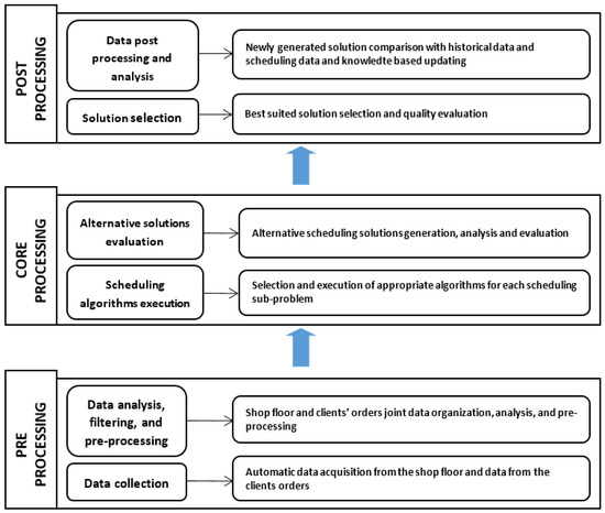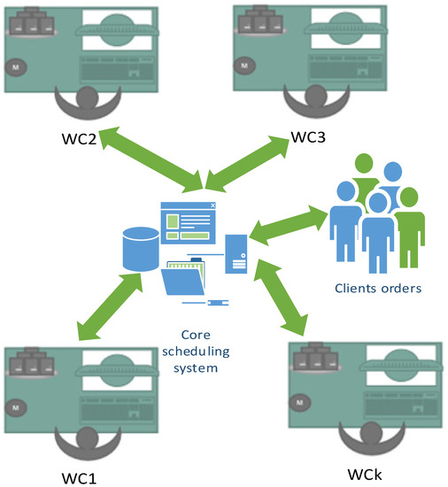 In this work, a developed interoperable manufacturing scheduling system (IMSS) was used for solving problems occurring in different kind of more or less complex manufacturing environments, namely in a job shop, by enabling to decompose them into simpler ones through a proposed scheduling model that is an extension of the Jackson’s model for enabling to solve general job shop scheduling problems with three or more work centers, by concatenating the partial solutions or schedules to form a complete solution for the whole original problem carried out by using a central or core scheduling system (CSS). In Figure 2, the architecture of the IMSS is shown, for an application example, occurring in an industrial company, which integrates three work centers (WC1, WC2, and WC3). This IMSS architecture includes thus the CSS, and which is interconnected with the work centers, enabling data sharing with the shop floor’s operational level, and by enabling to automatically acquire data through RFID and store it in a local database, along with further processing through the use of smart objects and additional devices and technology [5,40,41]. Moreover, the CSS is linked to a pre-processing module, which permits the insertion of information arising from the clients’ orders that is also inserted in the corresponding supporting database, and the whole set of information (joint factory and clients data) is subject to a pre-processing function of the IMSS, for data analysis, filtering and other pre-processing procedures, namely for dealing with incomplete data, with the support of historical data sets processed, along with methods for uncertainty treatment, based on dynamic, and fuzzy based approaches [42,43,44] (Figure 3 and Figure 4).