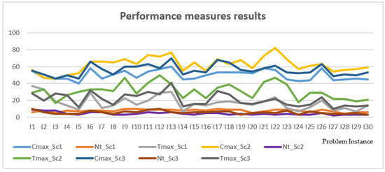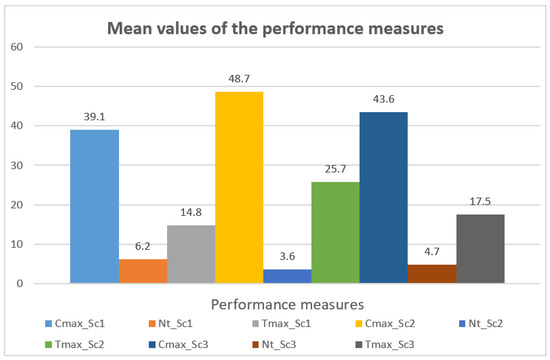 The mean values obtained through the execution of the thirty problem instances under the scenarios Sc1, Sc2, and Sc3, for the Cmax, Nt, and Tmax performance measures, correspondingly, are expressed in Figure 6.