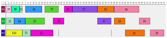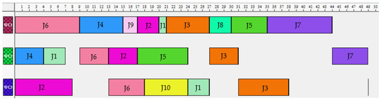 In the Figure 7, Figure 8 and Figure 9, are shown the Gantt charts about the best solutions found for the scenarios Sc1, Sc2, and Sc3, correspondingly, after the application of the proposed scheduling model presented in the Section 4.1, for the compilation of the complete sequence of the jobs to be processes in the corresponding work center, and once selected the best one.