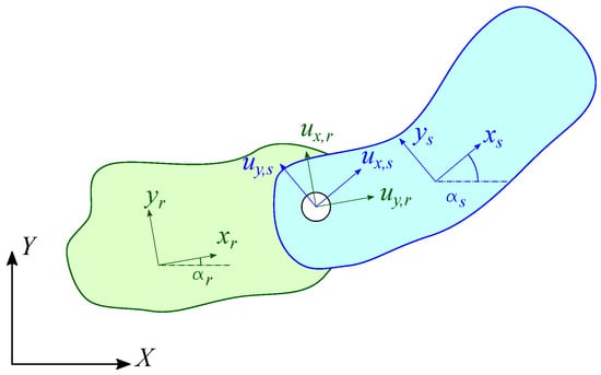Two bodies r and s connected by a revolute joint in the plane orthogonal to the revolute joint axis: local ( and ) and global () reference frames.