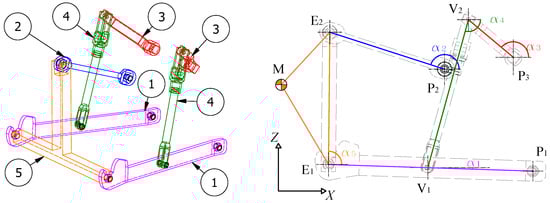 It is in fact a Watt six bar linkage. The schematic in Figure 2 shows a typical rear three-point linkage and highlights its main components: ① lower links; ② upper link; ③ input cranks; ④ lift rods; ⑤ implement. The implement is part of the operating machine and is considered as a rigid body, whilst all the other bodies are assumed to be deformable. In Figure 2, the boundary nodes of the different components are highlighted; and indicate the boundary nodes connecting the three-point linkage to the tractor and the operating machine, respectively; are the boundary nodes connecting the components of the linkage to each other; M is the center of gravity of the operating machine. It is based on a four-bar linkage composed of the lower links, the implement and the upper link, whose configurations are controlled by the kinematic chain composed by the input cranks and the lift rods. Note that the mechanism is planar, since all trajectories are parallel to the plane under the assumption of rigid links. However, when considering deformable links, vibrations can also occur along the Y direction. The main dimensions of the linkage, the inertial properties of the attached operating machine and the material properties are listed in Table 1. All the elements of the linkage are represented in scale in Figure 2.