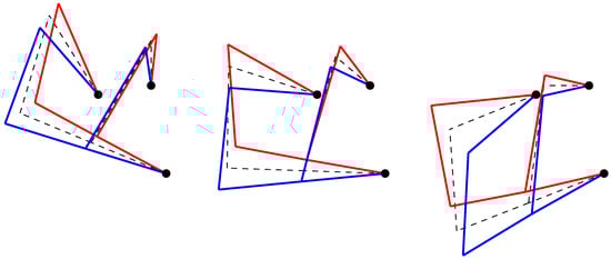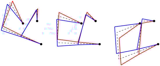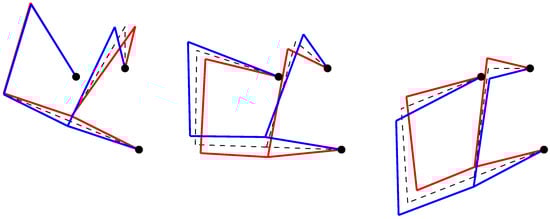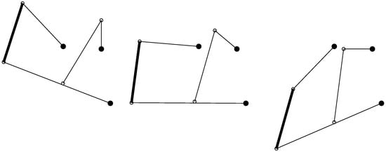 The results highlight the dependency of the natural frequencies on the configuration. Moreover, Figure 7, Figure 8 and Figure 9 show the displacements of nodes , , and for the first three mode shapes of the linkage in three different configurations.