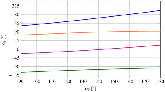 Since the three-points linkage is a 1 DoF mechanism, its configuration is defined by a single input coordinate, i.e., the angular position of the input cranks. Figure 3 shows three configurations of the linkage obtained for different angular position of the input cranks, i.e., 90, 140 and 180 degrees. The angular positions of all the other links can be obtained as the outcome of the position analysis of the mechanism as shown in Figure 4 for varying from 90 to 180 degrees.