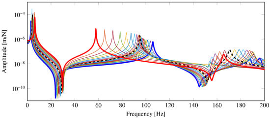 Finally, Equation (19) can be used to obtain the configuration-dependent FRFs, evaluated for spanning the angular range 90–180 degrees with an angular step of 2 degrees.