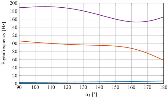 For each configuration, the first three natural frequencies and the mode shapes of the whole mechanism in the plane are identified. Figure 6 shows the configuration-dependent natural frequencies of the identified vibration modes of the three-point linkage.