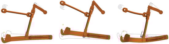 Three configurations of the linkage. (Left) = 90. (Middle) = 140. (Right) = 180.