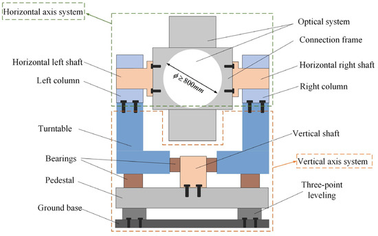 The internal structure of a typical photoelectric theodolite is depicted in Figure 1. The photoelectric theodolite consists of a tracking frame with attached optical systems, and the tracking frame can be subdivided into horizontal and vertical axis systems. To complete the tracking and observation of a target, the tracking frame allows for precise motion in the pitch and azimuth directions.