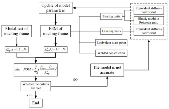First, a modal test is implemented for the tracking frame of the large photoelectric theodolite, and the natural frequencies and mode shapes of the first N-order are obtained via the modal identification software. Second, a multi-parameter FEM is established, followed by a series of parametric equivalent simplifications on the three-point leveling units, bearing units, and other components. By comparing the relative error of natural frequencies obtained from experiment and simulation, the gradient-less optimization method is used to modify the model’s parameters, and a set of parameters closest to the modal test results is obtained. Figure 2 illustrates the flow chart that describes the calculation strategy employed in this paper.