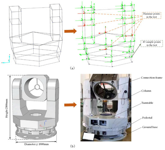 In Figure 4a, the red arrows represent the test’s excitation points and directions, with a total of 5 points and 11 directions. They are, respectively, located at the middle and upper left column, the bottom of the right column, the upper surface of the turntable and the lower surface of the pedestal. Note that all effective information of the transfer function matrix is obtained by moving the sensors without changing the position of the excitation points. Therefore, the modes obtained by each group of excitations are only partial modes. After all the excitations and sensor movements are completed, all the data are processed by N-modal software.