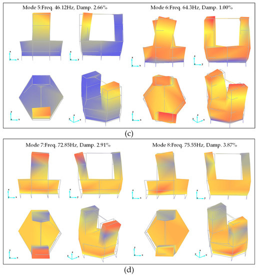 Mode shape diagram of the optimized model. (a) The first and second order mode shapes. (b) The third and fourth order mode shapes. (c) The fifth and sixth order mode shapes. (d) The seventh and eighth order mode shapes.