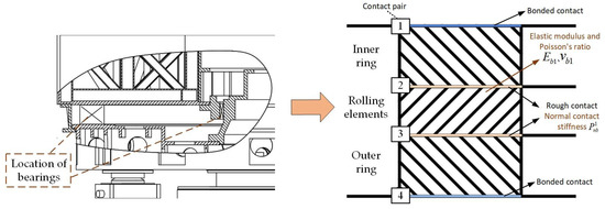 In accordance with the preceding description, the bearing unit has been reduced to three solid rings, which correspond to four contact pairs. Contact pair 2 between the inner ring and rolling elements and contact pair 3 between the outer ring and rolling elements are of the same contact type and are both set to a rough contact type that permits normal separation and greater friction in the tangential direction (specifies asymmetric contact behavior, using augmented Lagrange contact algorithm). The contact types of contact pair 1 and contact pair 4 between the inner and outer rings and the fixed surface are identical; they are both set to a bonded contact type that prohibits normal and tangential separation, and the Multi-Point Constraints (MPC) contact algorithm is implemented. The elastic modulus and Poisson’s ratio are assigned to the ring of rolling elements, and the normal contact stiffness is assigned to each contact surface of contact pairs 2 and 3.