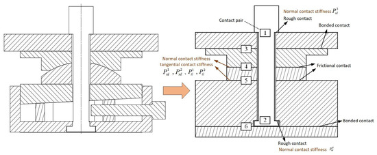 Due to being composed of bolts, spherical joints, and wedge blocks, the contact conditions of the three-point leveling units of the tracking frame are also complicated, and the simplification is also of great significance. In general, the contact simulation problem of a bolted connection uses the modeling method of a solid bolted connection, which has a higher calculation accuracy [21]; therefore, this modeling method is employed instead of spring element modeling. For ease of explanation, a single leveling unit is used as an example in this section. The outer surface of the hexagonal nut is simplified as a cylindrical surface, the joint surfaces between multiple bolted connections of leveling unit are subdivided into multiple mechanical parts, and respective contact conditions are set. The contact pairs of a single three-point leveling unit are illustrated in Figure 9. The contact situation of three-point leveling units is relatively complex, and this location primarily affects the low-order natural frequencies of the entire machine, which is the focus of this model; consequently, it is crucial to establish suitable contact conditions. The contact pairs 1 and 2 between the bolt and the two joint surfaces are both set to a rough contact type that permits normal separation and greater friction in the tangential direction. The contact pairs 4 and 5 are set to a frictional contact type that permits normal separation and tangential friction (the above two contact types both specify asymmetric contact behavior, using the augmented Lagrange contact algorithm). The contact pairs 3 and 6 are both set to a bonded contact type, which does not permit normal and tangential separation, and the MPC contact algorithm is employed. The normal contact stiffness and tangential contact stiffness are assigned to each contact surface of contact pairs 4 and 5 and the normal contact stiffness is assigned to each contact surface of contact pairs 1 and 2.