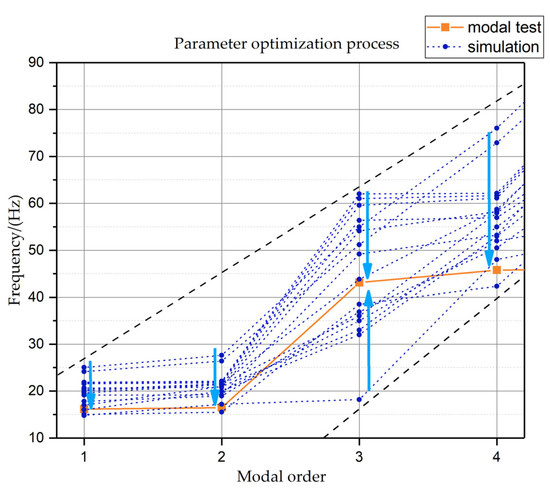 Each group of different parameters will produce different numerical simulation results, and the optimization process will yield a series of reference candidates and their corresponding natural frequencies. Each set of frequency values is exported and evaluated by inequality (2) of Section 2. The final optimization result is a set of parameters satisfying the inequality.