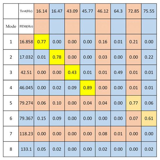 Figure 14 depicts the MAC diagram of mode shapes between the simulation and the experiment, allowing for a more direct comparison of mode shape orthogonality.