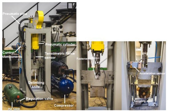As part of the project activity, a device (Figure 1) was constructed, on which it is possible to carry out the experimental measurements of chipless wood splitting and debranching. Due to the unsafe conditions for humans while collecting data in the real delimbing process, we considered it beneficial for safety purposes and data robustness to construct laboratory equipment that could reproduce the conditions and phenomena very close to the technical reality that occur throughout the delimbing process, from the point of view of the cutting tool. The testing of delimbing knives is otherwise only possible on a harvester head; however it was safer to implement testing equipment prepared specifically for the research in order to observe the mechanical damage. The experimental device Figure 1. was designed from profiled steel and shaped elements via welded joints. The dimensions of the device are 1404 × 500 × 500 mm; the delimbing knife is 400 mm far from the wood sample. An air tank with a volume of 80 L was placed outside of the device. The reduction valve with a working pressure of 1.2 MPa for setting constant air flow in the system was a part of the air tank. The pneumatic cylinder with parameters according to standard ISO 6431 was joined to the device with screws. The tensometric force sensor HBM S9M was placed on the piston rod with designed fasteners. The starting movement of the cylinder was made possible by pneumatic mixing control type AC 9010 G1/2 UNIVER with manual control, equipped with a non-return valve and an air damper. The SAI/L acceleration sensor (SZ1/50) ensured the constant cutting speed of the branching knife. The sensor was connected to the 8-channel measuring control panel measurement unit Quantum MX 840 via a cable. The advantage of the measurement unit is compatibility with a device produced by the company HBM “Hottinger Brüel & Kjaer GmbH”. The cutting device consists of a flat delimbing knife placed on the piston and secured by a pin. After moving the piston rod, the knife was moved toward the wood sample and it created transverse delimbing wood cutting. The wood sample was protected against movements by a pressure roller controlled by an independent pneumatic control unit consisting of a pneumatic remote control, a choke valve, a starting valve and an exhaust valve in output from the pressure roller.