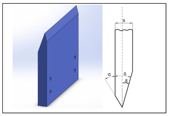 In the case of the chipless wood cutting process, the cutting tool was easier and more reliable in comparison with the experimental geometry of the saw chain. The operational costs were significantly lower. Analyses defining parameters for the delimbing process were made from research conducted [11,13,14] and the analysis performed at the Department of Environmental and Forest Technology of the Technical University in Zvolen [7,13]. Based on these studies and analyses, it was noted that the thickness of the delimbing knife had a significant influence on the cutting resistance in wood penetration. With an increase in the thickness of the cutting tool (S in Figure 2.), energy consumption increased and the quality of the cutting surface worsened. Delimbing is expensive in the felling process, and it usually decreases the final profit [15,16]. Based on this, flat delimbing knives were made (Figure 3). The knife with a straight cutting edge was used for an experimental measurement due to the easy evaluation of cutting forces responsible for the wear of the cutting knife. Three types of delimbing knives were used for laboratory measurements. The shape and angular geometry of the delimbing knife can be seen in Figure 2. The delimbing knives were made of the same material, EN 41 9452 DIN 58SiCr8/WNr, but had different tool geometry, as shown in Table 1.
