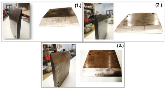 Delimbing knife No. 1, shown in Figure 2, is made of the material EN 41 9452, representing a class-19 tool steel in an undamaged state before the start of the experiment. This type of material used in the experiment is a low-alloy Si-Cr steel suitable for cold work [18]. The reason behind the use of this material is its applicability to the production of medium-sized tools for machining and cutting non-metallic materials, especially wood, with the possibility of intermittent cutting with high demands on toughness. It is very malleable at the temperature range of 1050–850 °C with slow cooling. Good machinability of the material enables perfect sharpening of the cutting edge after wear. The cutting edges of the cutting knives were machine-sharpened before the experiment according to the defined parameters [2,7]. To confirm the exact type of the knife’s material, metallurgical analysis and material analysis were performed with the TASMAN Q4 test device in which the output tests of samples showed the percentage of carbon and silicon content in the material according to the defined technical standard of the knife material.