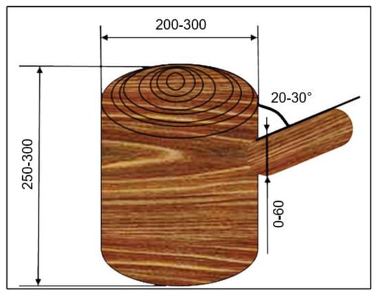 The experimental measurements for defining the wear of the cutting edge on the delimbing knife were performed with Norway spruce (Picea abies) (Figure 4). Material samples for the experimental measurements were in the shape of logs with a diameter of 20 cm to 30 cm and a length of 25 cm to 30 cm. The diameters of branches growing from the trunks were in the range of 0 to 60 mm and their lengths were in the range of 40 mm to 120 mm. The branch growing angle was 20–30° The size of the diameter of the basic wood trunk did not affect the cutting force. The moisture of the wood should represent the moisture of freshly sawn wood; i.e., the fiber saturation point was = 30%.