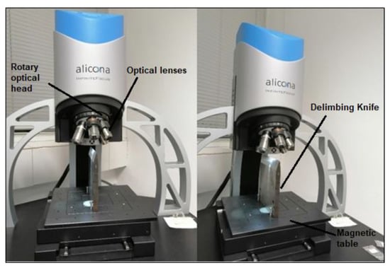 The analysis of the cutting edge wear on the experimental delimbing knife was performed via a 3D optical device called Alicona Infinite Focus. All relevant surface properties of the micro-precision components were measured with just one multifunctional measuring sensor. We achieved traceable measurement results with high reliability and a precise vertical resolution of up to 10 nm.