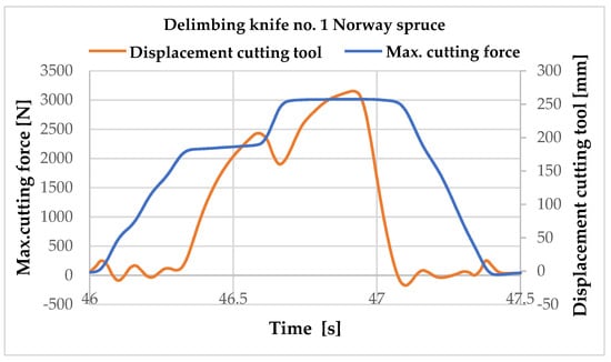 Figure 11 shows the course of the process of delimbing the sample material spruce with delimbing knife No. 3 and a wood diameter in the range of 20–40 mm. The maximum cutting force was recorded at the point of separation of the branch from the tree trunk. When the pneumatic cylinder was set in motion, we recorded a change in the path of the cutting tool, which changed with respect to the place where the branch grew out of the sampling wood. The maximum cutting force Fc was recorded at the point of separation of the branch from the tree trunk, where the wood is defined as the reaction wood. The course of the delimbing process for the first delimbing knife and the second delimbing knife recorded different energy intensities of the cutting tool due to the change in the sampling wood when using the same interval of branch diameters.