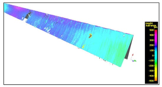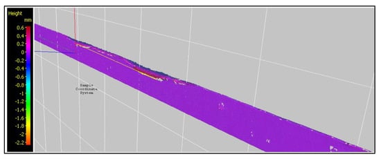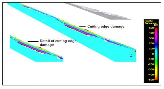 The wear of the cutting edge is evaluated in Figure 10, where the abrasion is only partial. This means that this type of a delimbing knife can be considered as suitable in terms of delimbing knife wear. The wear demonstrated by the color spectrum shows the embossing of the worn material on the cutting edge of the delimbing knife. Using vector recalculations and the point method of mutual distances, the wear distance toward the material was evaluated with a value of 0.3 mm on average.