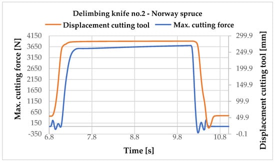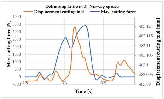 Figure 9 shows the course of the process of delimbing of the sample material, spruce, with a diameter in the range of 20–40 mm using delimbing knife No. 2. The maximum cutting force was recorded at the point of separation of the branch from the tree trunk due to the definition of the wood at this point as reaction wood. The specific properties of the reaction wood and the change in the angular geometry of the delimbing knife were reflected in the steep increase in the cutting force, where its maximum for this type of sampling wood is 3.75 kN. As can be seen in the graph, the influence of the cutting tool at the selected interval of wood diameters recorded a longer process of separation of the branch from the tree trunk.