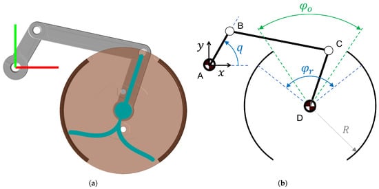 Design of the proposed mechanism. CAD model (a) with the four-bar linkage system (light grey) and the rotary distributor with the blades (teal green); mathematical model (b).
