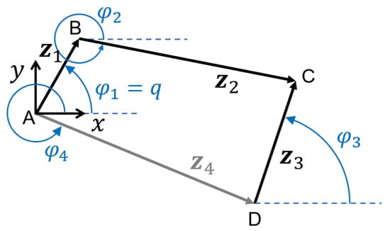 Figure 3. Schematic of the four-bar linkage mechanism. The vectors represent the position of the links of the mechanism.