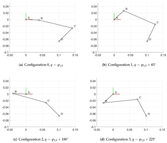 Configurations of the synthesis. (a) configuration 0; (b–d) configurations of the precision points. The same configuration numbers are reported in Figure 5.