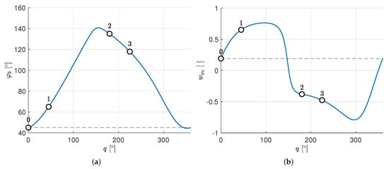 Rocker position (a) and speed ratio (b) for each crank configuration, where q is the displacement with respect to configuration 0. The dots represent the configuration 0 (to the left of each graph) and the three precision points (where with ). Dashed lines show how and .