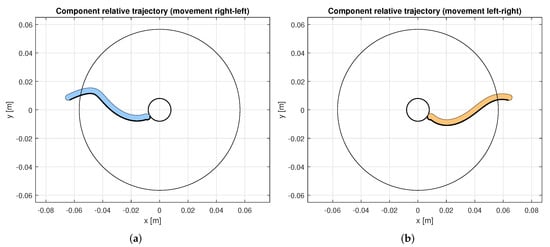 From a manufacturing point of view, it is more convenient to produce a single blade rather than two distinct blades. In this sense, it is mandatory, for our example, to consider only the right blade. In fact, if the left blade is considered, during the left-right movement (which would require the right blade) the trajectory of the component in the relative reference frame would still be the orange of Figure 8. As a result, since the trajectory pierces the left blade, the component would interact with the blade, producing unexpected behavior. On the contrary, if the right blade is considered, in the right-left movement the component would fall producing a certain distance to the right blade. Nonetheless, the free fall motion would still be guaranteed.