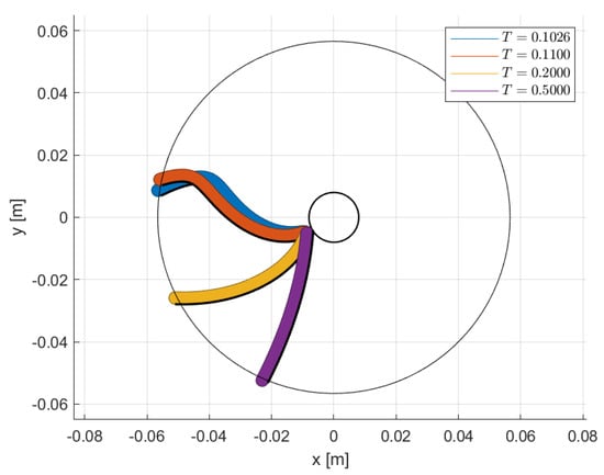 Varying T has an important influence on the final blade shape. In Figure 7 are shown different blades for different T values where, for simplicity, the component trajectories are stopped at . The more the time T increases, the more the shape of the blade resembles a single-curvature arc, and its initial position (the one depicted in Figure 7) tends to align to the vertical direction. In this way, components that fall from the inlet are not blocked; thus, they simply fall through the device without grouping on the blade.